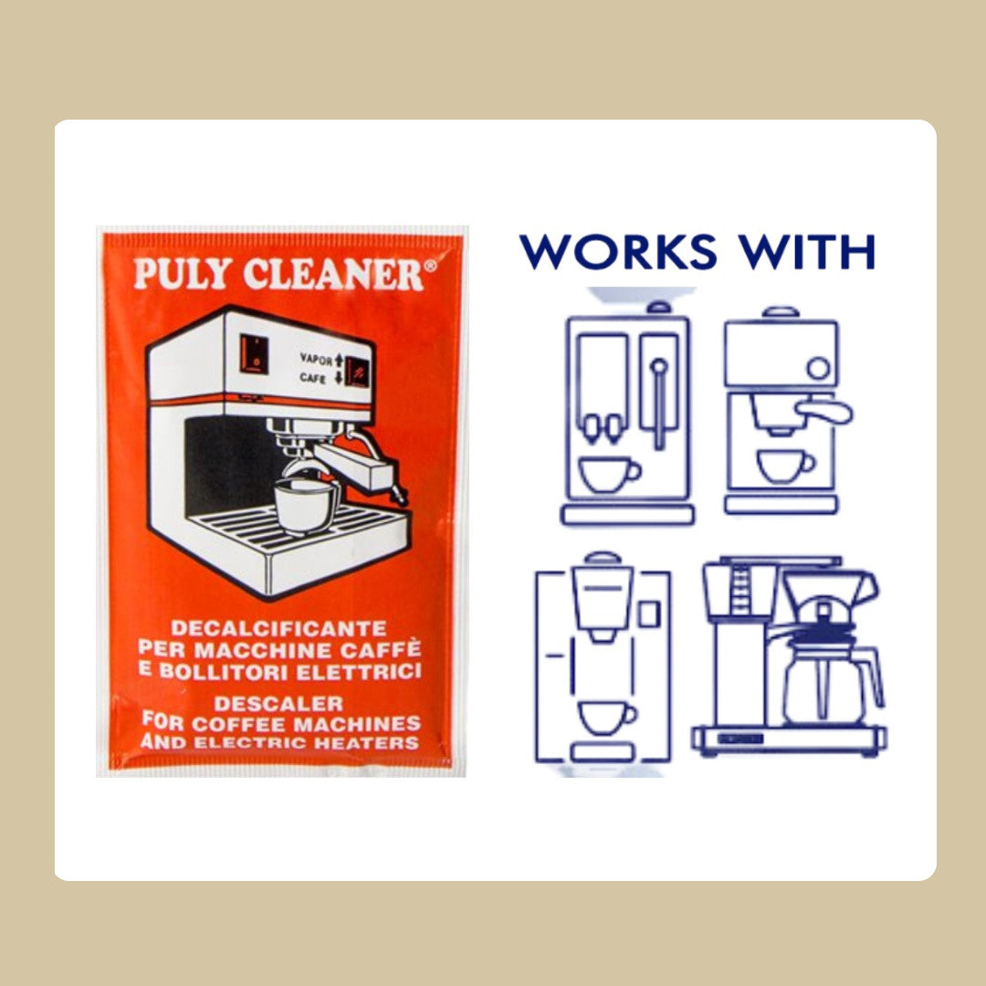 Specifically designed for descaling coffee machines. Made with 100% food-grade acid and 99% biodegradable. Includes complete instructions for easy use. Manufactured in Italy by Asachimici, experts in food industry cleaners since 1890. Puly Cleaner Baby Descaler 25g Sachets – Espresso machine cleaning powder.